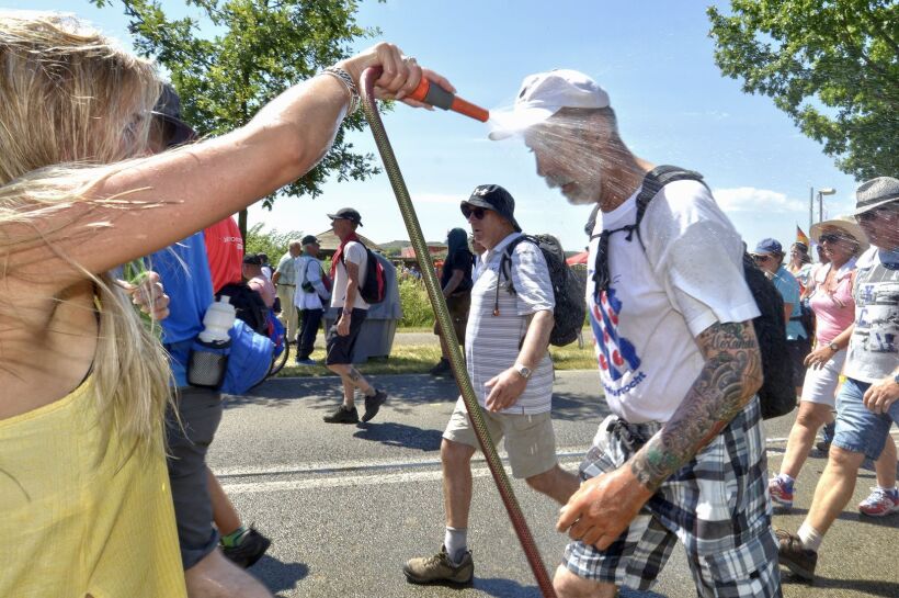 Een beetje verkoeling kunnen de wandelaars wel gebruiken. – Foto: ANP