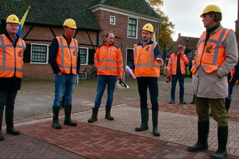 Burgemeester Stapelkamp met de wethouders Groters en Kok krijgen uitleg van de projectleiders Niek Nijhof en Jertjan Sikking. Ze staan op de plek waar het krattenveld ondergronds wordt aangelegd. – Foto: Eveline Zuurbier