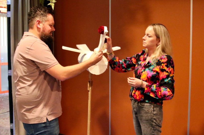 Het huidige koningspaar mag na Hans en Renate Pillen van De Koppelpaarden elk een dahlia op de vogel plakken. – Foto: Eveline Zuurbier