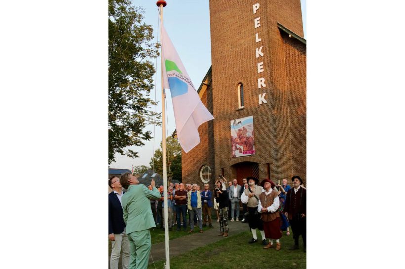 Het hijsen van de vlag van de Vereniging van Nederlandse Vestingsteden vormde een officiële ceremonie voorafgaand aan de uitreiking van de Aaltense Erfgoedprijs. – Foto: Eveline Zuurbier