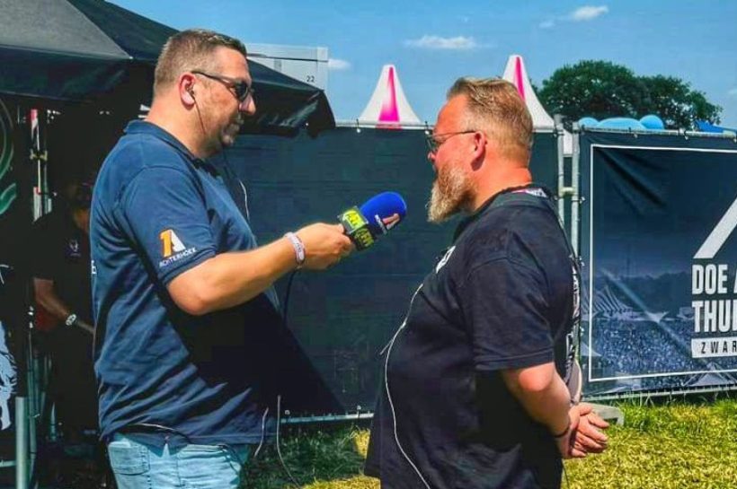 Radiomaker Mark Nijhof interviewt Chuck Sterk van de Feestfabriek ‘Alles kump goed’. – Foto: 1Achterhoek