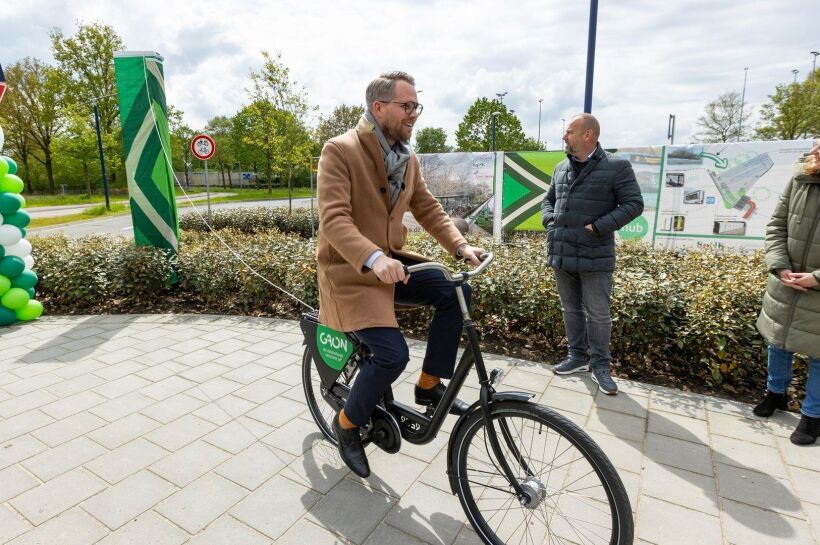 Bart Porskamp, lid thematafel Mobiliteit & Bereikbaarheid 8RHK ambassadeurs en wethouder Oost Gelre, die het aanwijzingsbord van de hub al fietsend onthulde: “We zijn landelijk koploper op het gebied van Publieke Mobiliteit, dat openbaar vervoer, deelvervoer en doelgroepenvervoer combineert, daar zijn we trots op.”