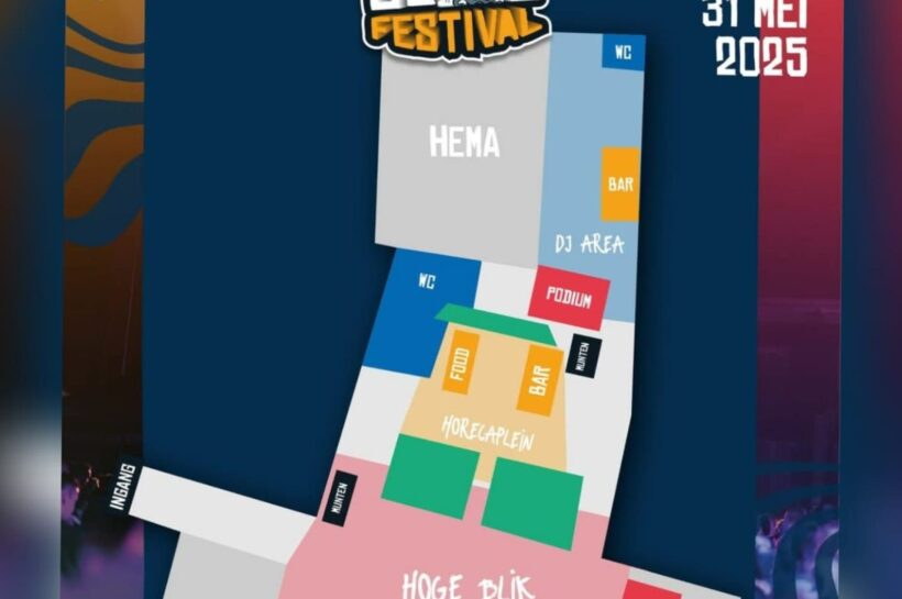 Op de plattegrond hierboven zie je hoe het terrein eruit gaat zien en wat de indeling wordt. Nieuw dit jaar is dat er niet één, maar twee podia op het terrein te vinden zijn. Het vertrouwde podium en het nieuwe DJ-podium die naast de HEMA komt te staan.