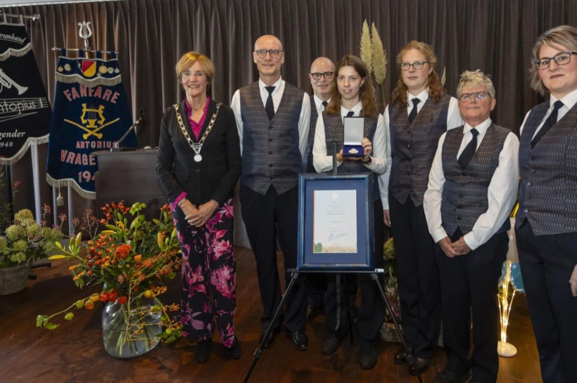VRAGENDER – Op zaterdagmiddag 28 oktober reikte burgemeester Annette Bronsvoort een Koninklijke Erepenning uit aan Fanfare St. Antonius te Vragender. De uitreiking vond plaats ter gelegenheid van het 75-jarig jubileum. De Erepenning is toegekend bij Koninklijk Besluit van 27 juni 2023 vanwege de verdiensten van de fanfare op cultureel en maatschappelijk gebied, en vanwege haar verbindende rol in Vragender.