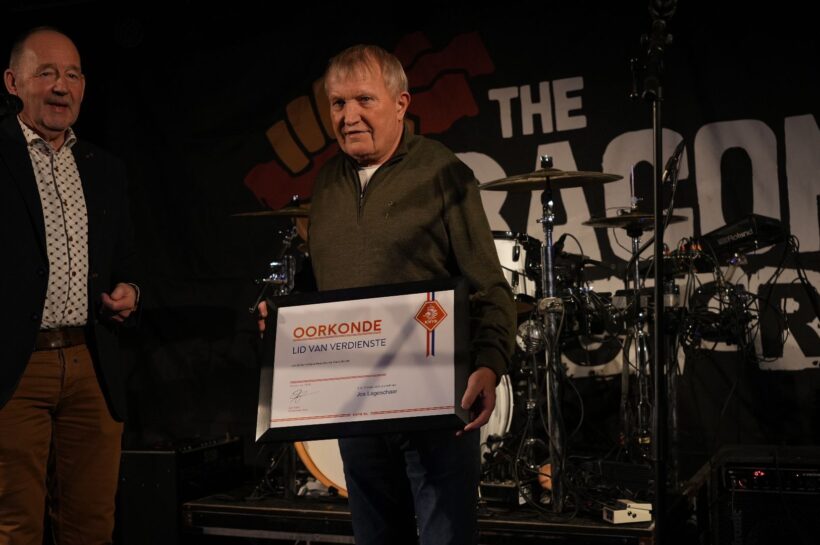 VRAGENDER – Jos Lageschaar is zaterdagavond 18 januari tijdens het 90-jarig jubileumfeest van KSV Voetbal benoemd tot ‘Lid van Verdienste’ van de KNVB. Jos werd door Theo Hulshof, ambassadeur van de KNVB, in het zonnetje gezet vanwege zijn tomeloze inzet voor de club. Een bijzonder weerzien voor de twee, want Theo werd als trainer met Jos als leider aan zijn zijde in 1997 kampioen met KSV 1 in de zesde klasse.
