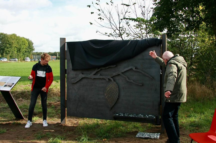Marianum-leerling Joep Karnebeek die het ontwerp maakte, onthult samen met Lieveldenaar Joop te Brake het herinneringsmonument aan het Joodse werkkamp – Foto: Eveline Zuurbier