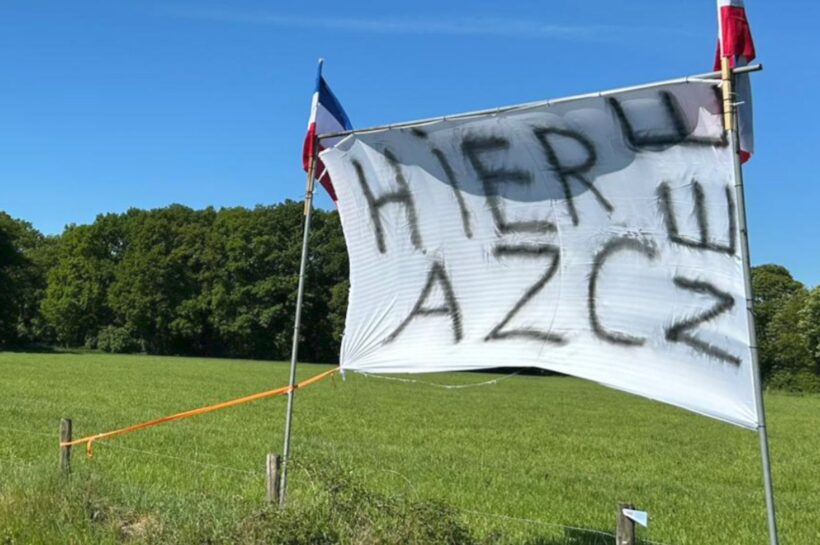 Een spandoek op de plek waar het azc in Aalten moest komen – Foto: Omroep Gelderland
