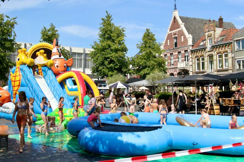 LICHTENVOORDE – Op afstand hoor je het geluid van plezier makende kinderen. Duidelijk herkenbaar alsof in hartje centrum van Lichtenvoorde er een zwembad is opengegaan. Dichterbij gekomen staat het marktplein vol met grote opblaaswaterattracties met in de hoek een kindercocktailbar. Ranja, een broodje knakworst, fruit met kaas aan stokjes geregen. “Alles is vandaag gratis; de waterattracties en de zomerse versnaperingen”, zegt Madelon Kuijk die namens het Ondernemersfonds de boel heeft opgetuigd. “Wel je handdoek meenemen, de rest doen wij.”