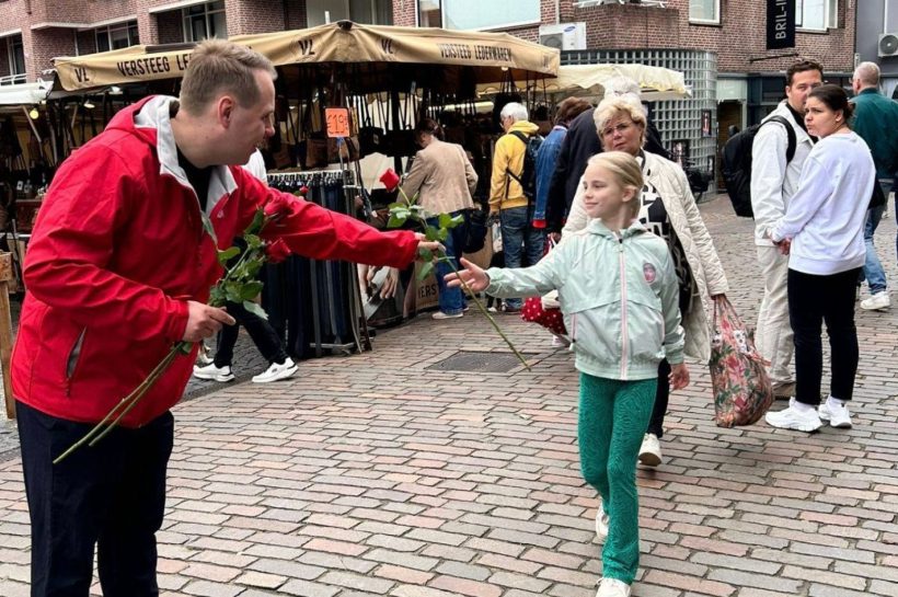 Wessel Lammers deelt rozen uit tijdens de campagne voor de Europese verkeizingen.