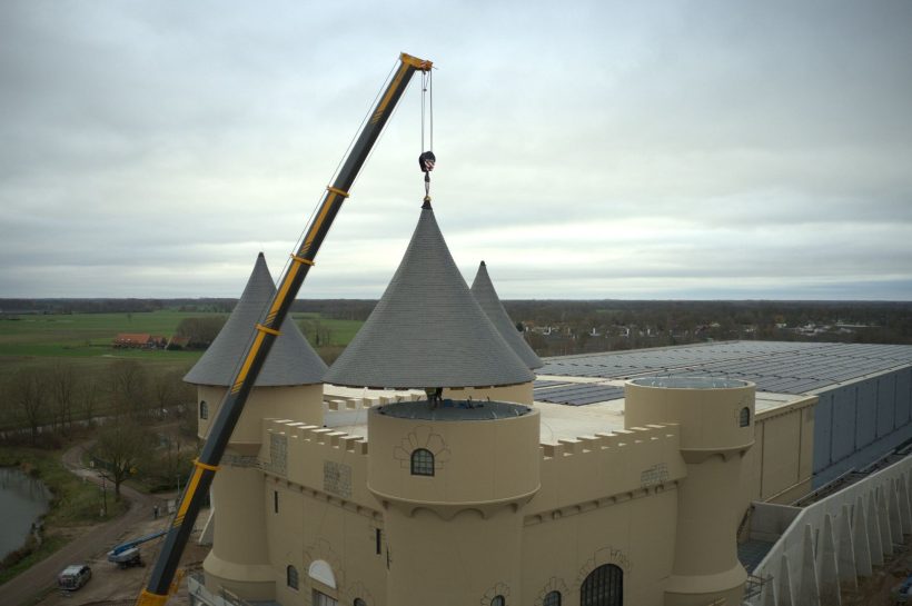 GROENLO – Het is een sprookjesachtig gezicht als je nu over de provinciale weg N18 bij Groenlo rijdt. Dinsdag werden vier imposante torens bovenop het kasteel van attractiepark Bommelwereld geplaatst. Met deze mijlpaal is het hoogste punt van de bouw bereikt.