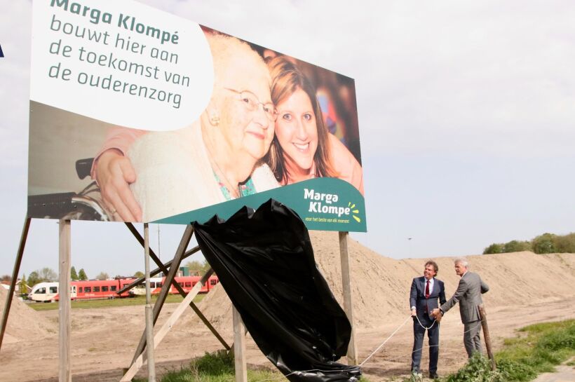 Er verschijnt een brede lach op de gezichten van wethouder Visser en bestuurder Duvigneau van Marga Klompé. Het is niet meer dan logisch, aangezien de voorjaarszon zich voor het eerst laat zien en zorgt voor een stralende sfeer. Er wordt getrakteerd op een drankje en een gebakje. Enkele tientallen mensen van de gemeente Winterswijk en van de zorginstelling Marga Klompé zijn getuige van dit officiële moment. Wethouder Gosse Visser spreekt de woorden uit: “Vandaag is een mijlpaal bereikt in het proces van tal van ontwikkelingen hier, in de spoorzone, wat vroeger een rangeerterrein was. Er is al veel gebeurd en er staat nog veel te gebeuren hier. Het Gerrit Komrij College en de turnhal zijn er gebouwd, en verderop in de richting van het oude politiebureau worden woningen gebouwd”, zegt hij trots en verwijzend naar de plannen van Marga Klompé.