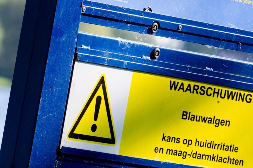 Er wordt voor gewaarschuwd om niet door deze drijflaag heen te zwemmen en er geen kinderen in te laten spelen of honden van het water te laten drinken.